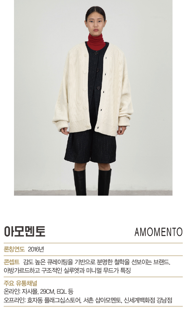 지난 2017년부터 해외 오더 문의가 들어와 2018년 본격적으로 해외 수주에 나선 이 브랜드는 현재 SNS 팔로어의 40%가 해외 고객일 만큼 글로벌 시장에서 높은 인지도를 자랑하고 있다. 수입 편집숍 ‘샵아모멘토’에서 브랜드 ‘아모멘토’로 비즈니스 영역을 확장한 만큼 브랜드와 유통 비즈니스 모두에서 두각을 드러내며 성장하는 모습이 인상적이다.