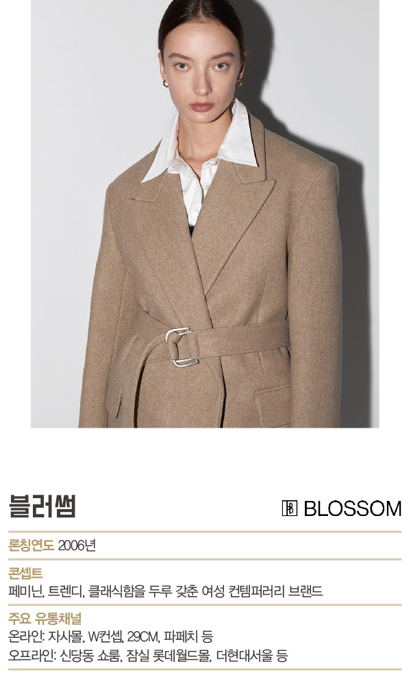 블러썸에이치컴퍼니(대표 박혜원)의 ‘블러썸’은 클래식하고 모던한 스타일에 유니크함을 더한 여성복 브랜드로 인기를 얻어왔다. 고급스러운 소재와 감각적인 클래식 스타일로 팬덤을 쌓았으며 올해 로고리스 ‘올드머니룩’ 스타일이 흥행하면서 볼륨화에 더 탄력을 받았다.