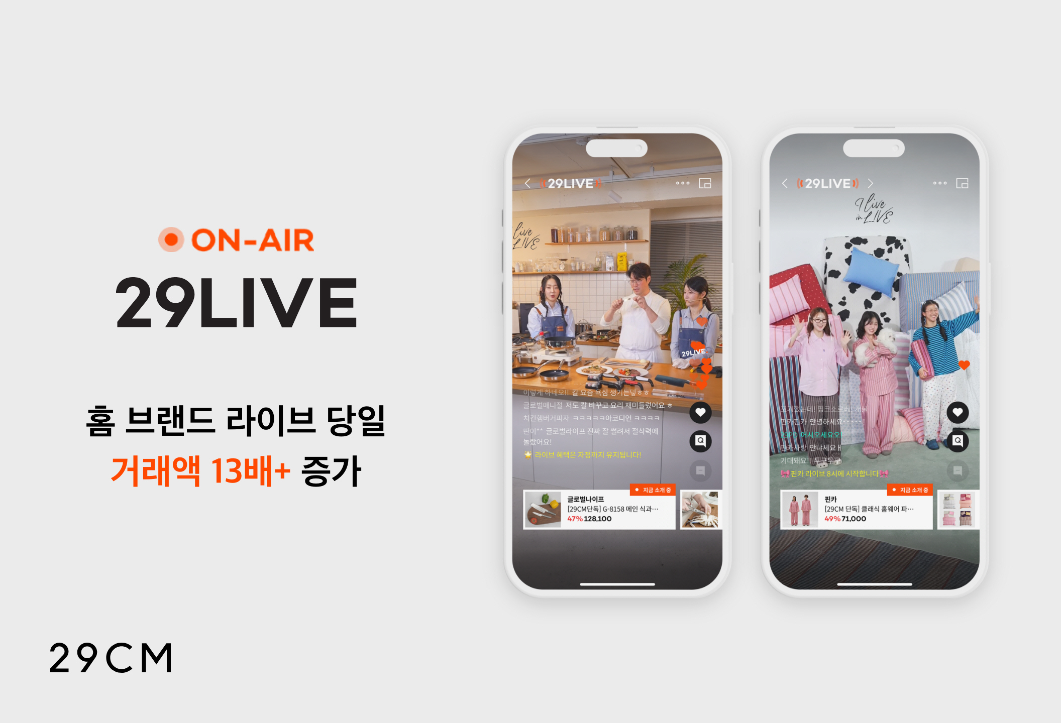 29CM가 올해 1월부터 4월까지 29라이브에 출연한 홈 브랜드의 성과를 분석한 결과 회차당 누적 시청자 수는 평균 2.8배, 실시간 채팅 참여 수는 3.6배 이상 증가했다. 라이브 방송에서 고객 참여가 활발해지면서 브랜드의 거래액도 늘었다. 실제로 참여 브랜드별 방송 직후 24시간 동안의 거래액은 직전 2주간의 일평균 대비 13배 이상 상승한 것으로 나타났다.