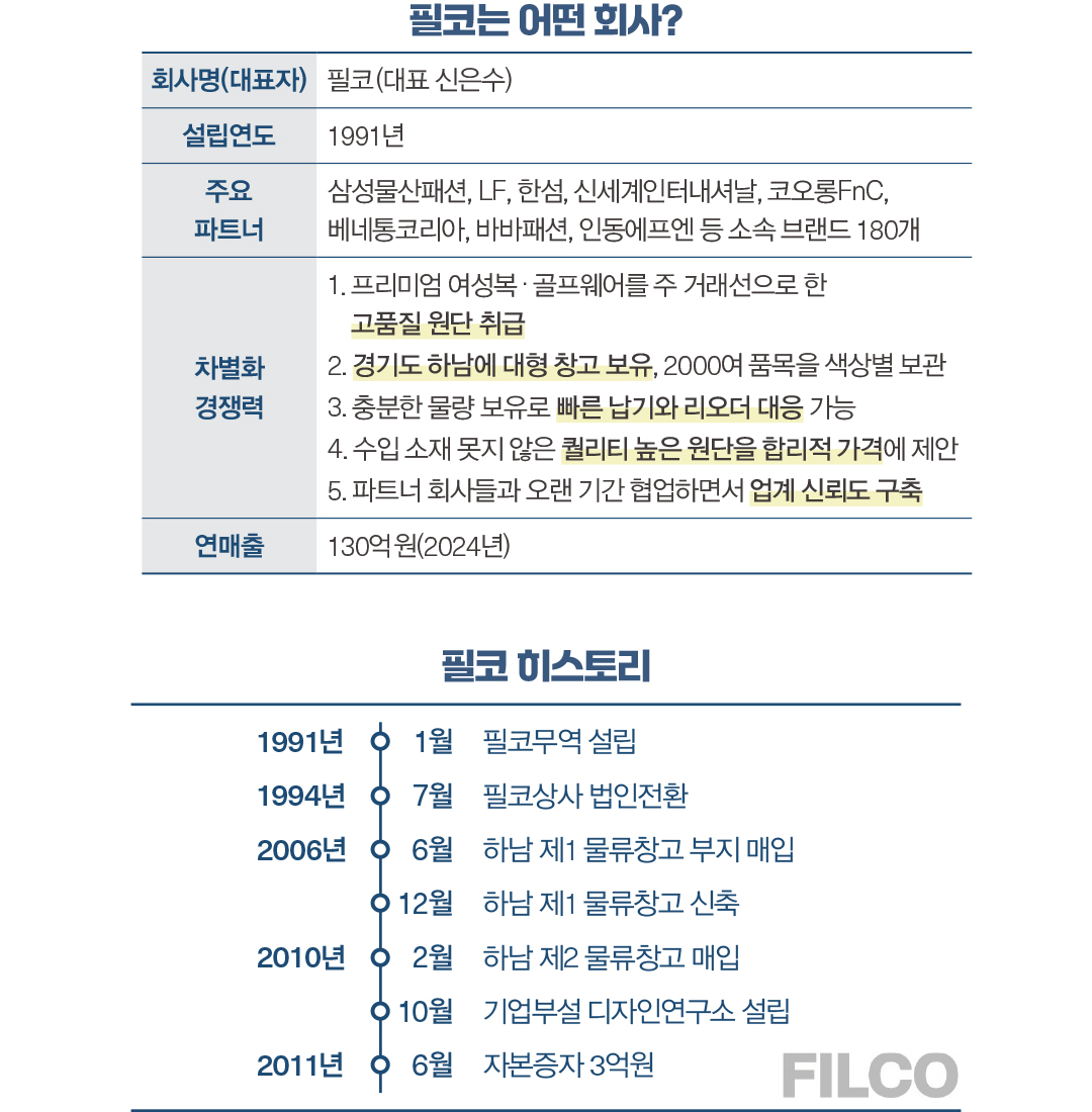 K-원단의 대표주자, 필코(대표 신은수)가 35년간 다져 온 전문성과 신뢰를 바탕으로 더욱더 사세를 확장하고 있다. 필코는 국내 프리미엄 여성복 마켓에서 모르는 곳이 없을 만큼 이 회사의 주요 파트너는 한섬, 삼성물산패션부문, LF, 신세계인터내셔날, 코오롱FnC 등 패션 대기업들이다. 또 바바패션, 인동에프엔, 베네통코리아, 동광인터내셔날, 송지오인터내셔널, 수인터내셔날, 발렌시아 등 패션기업과 오랜 기간 동반자로 함께하고 있다.