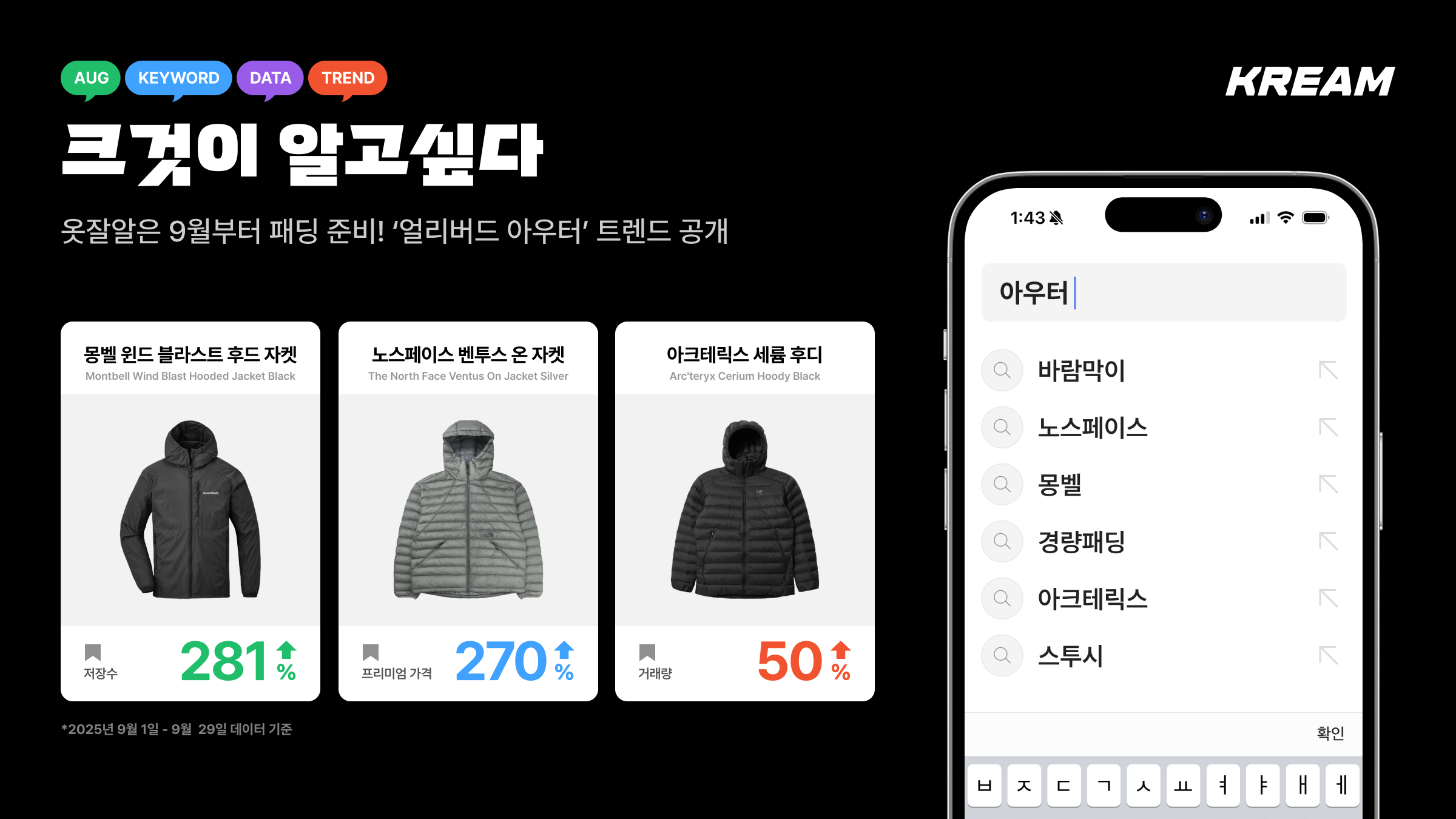 크림(대표 김창욱)이 2025년 F/W 주요 트렌드로 바람막이·패딩 등 ‘얼리버드 아우터’를 꼽았다. 크림이 9월 발표한 패션 트렌드 리포트 ‘크것이 알고싶다(크알 리포트)’에 따르면 9월 초 바람막이·경량패딩 등 가벼운 아우터의 거래량이 증가한 데 이어, 9월 중순부터는 패딩 등 헤비 아우터 거래가 활발히 이뤄지고 있는 것으로 나타났다. 해가 갈수록 봄·가을이 짧아지면서 아우터 수요가 예년보다 점차 앞당겨진 것으로 분석된다.