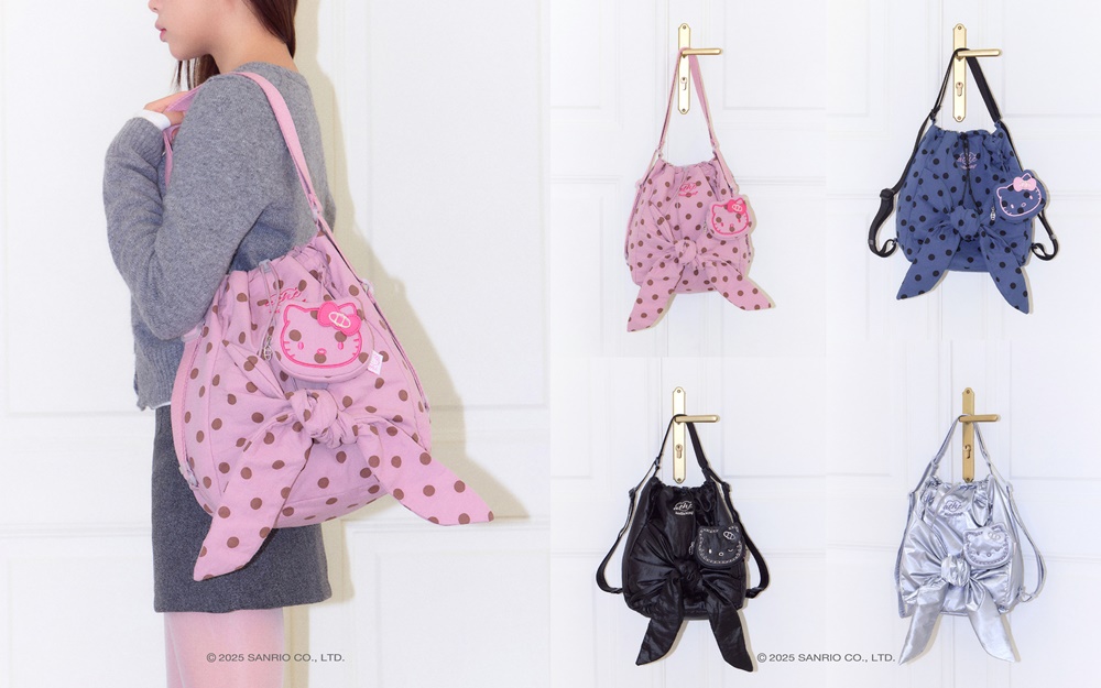 먼저 브랜드 베스트셀러 ‘르봉백’이 헬로키티를 만나 새롭게 재탄생했다. 헬로키티 실루엣의 참 장식을 포인트로 활용하고, 리본 디테일에는 아떼 바네사브루노의 심볼을 금속 장식으로 적용해 특별함을 높였다. 내외부에는 핑크색 리미티드 라벨을 부착해 소장 가치를 높였으며, 글로시한 광택감의 블랙∙실버부터 도트 패턴의 핑크∙블루, 레오파드까지 다양한 컬러와 패턴으로 구성했다.