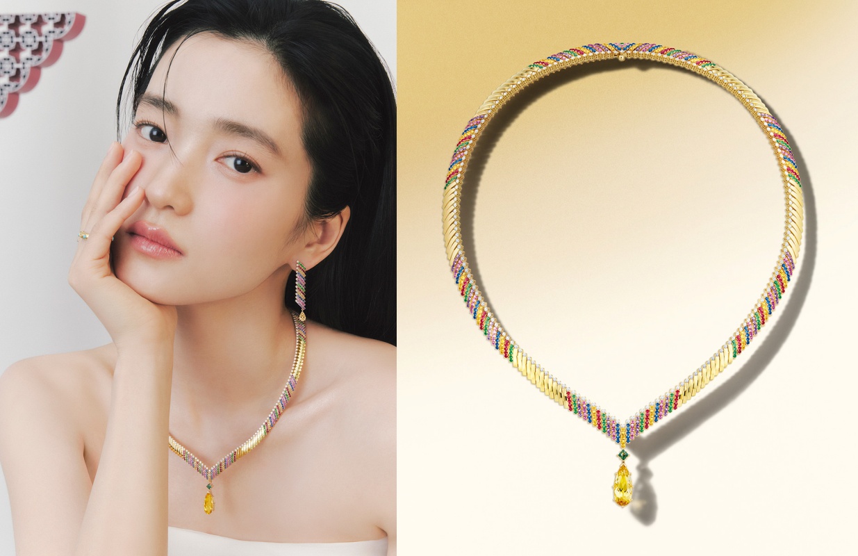 첫 번째 화보 속 김태리는 미니멀한 스타일링으로 컬러감이 돋보이는 주얼리를 매치해 시선을 사로잡았다. 김태리가 착용한 볼륨감 있는 실루엣의 목걸이와 드롭형 귀고리는 이슬방울(Dew) 모티브의 메인 보석을 중심으로 색동의 다채로운 색감을 담은 유색 보석과 옐로우 골드 특유의 깊은 금속 광택이 어우러져 고급스럽고 풍성한 분위기를 자아낸다.